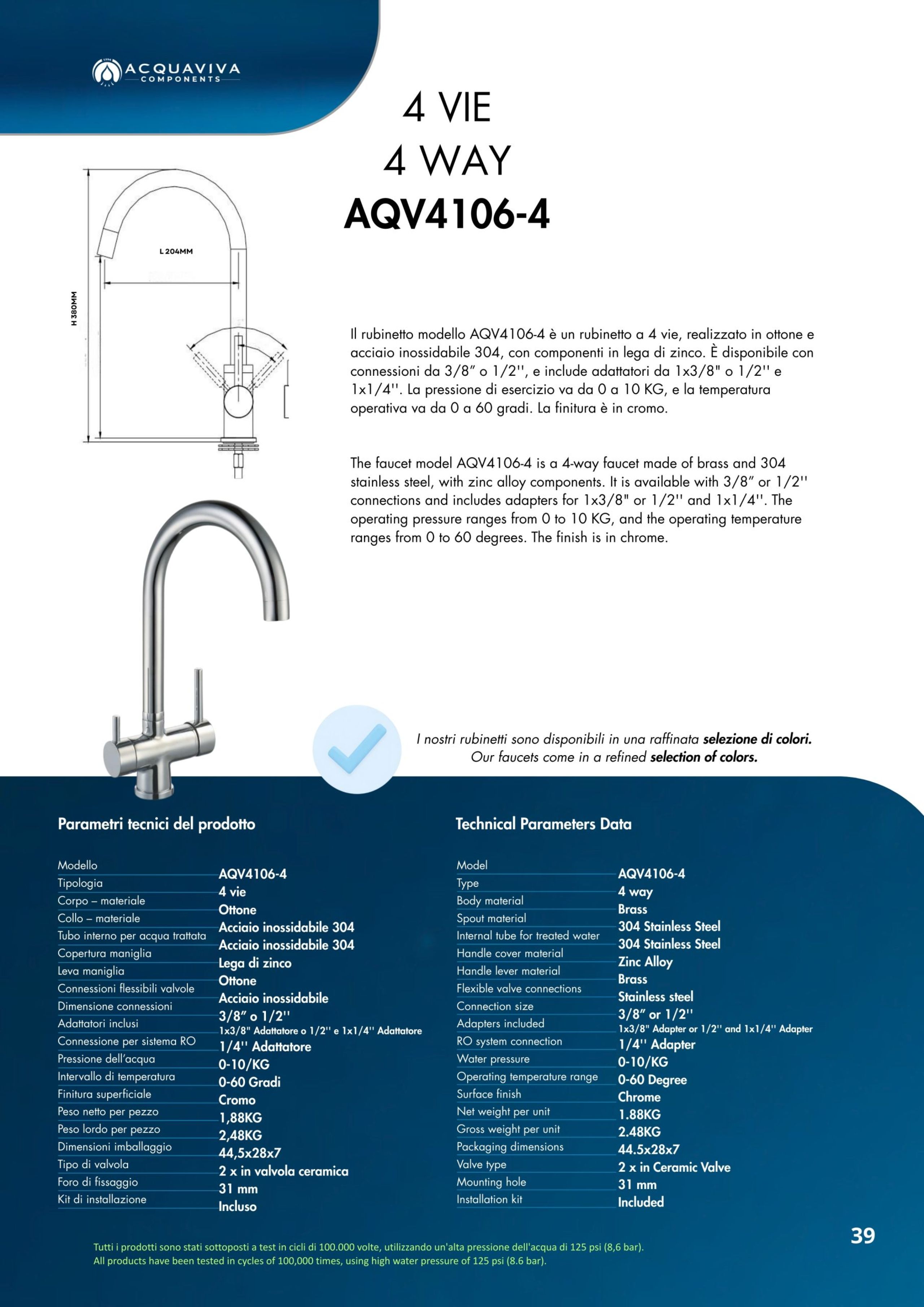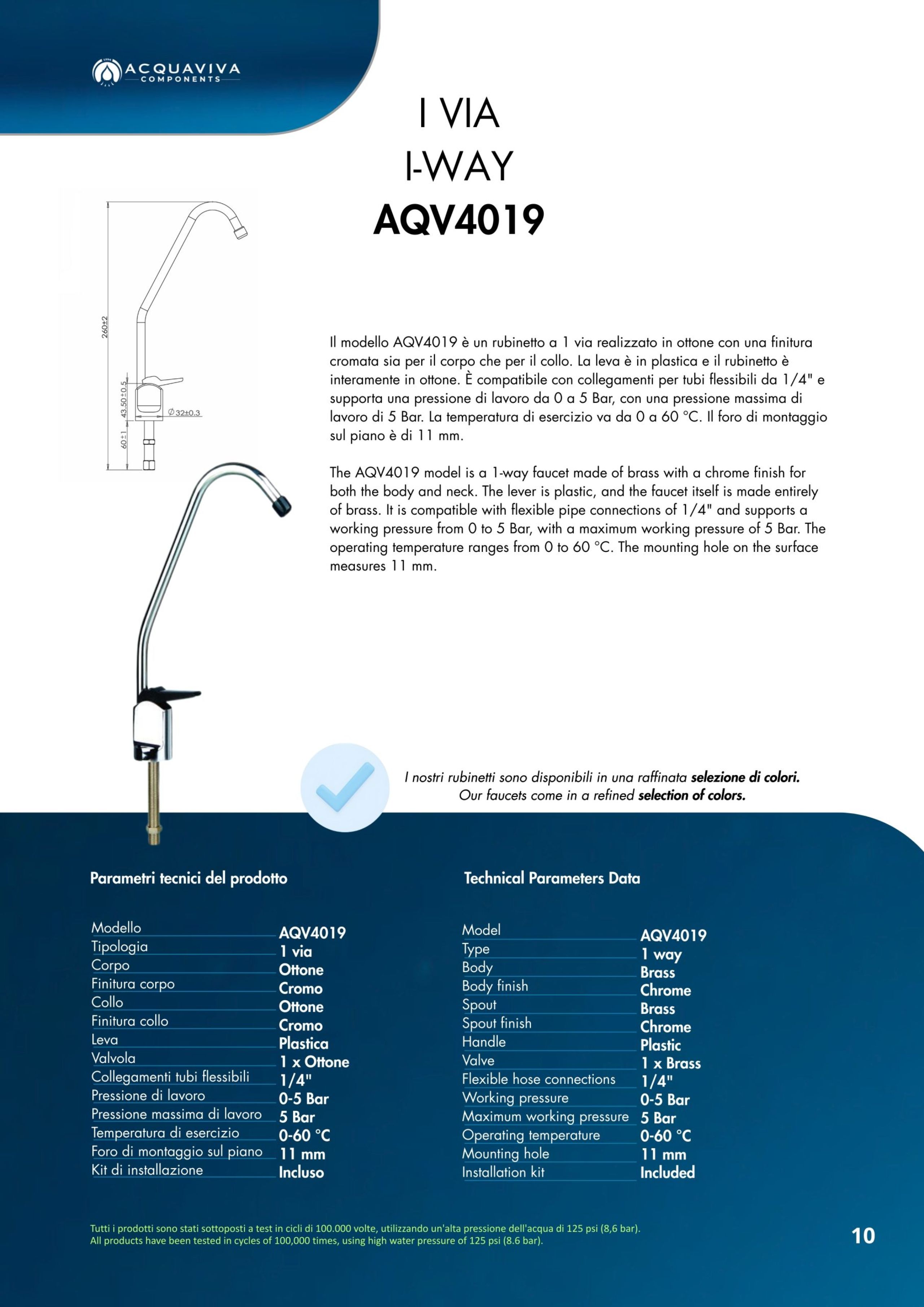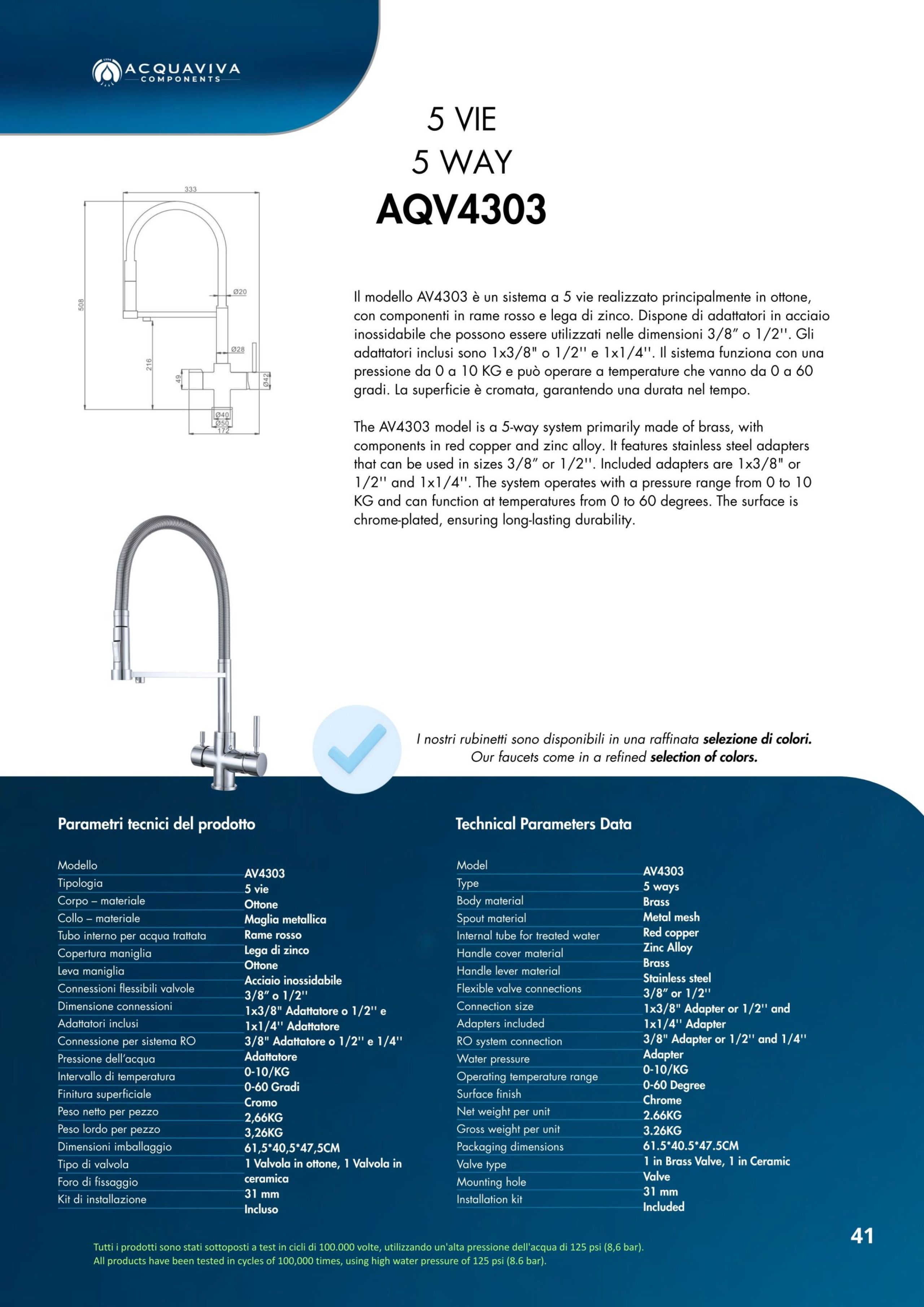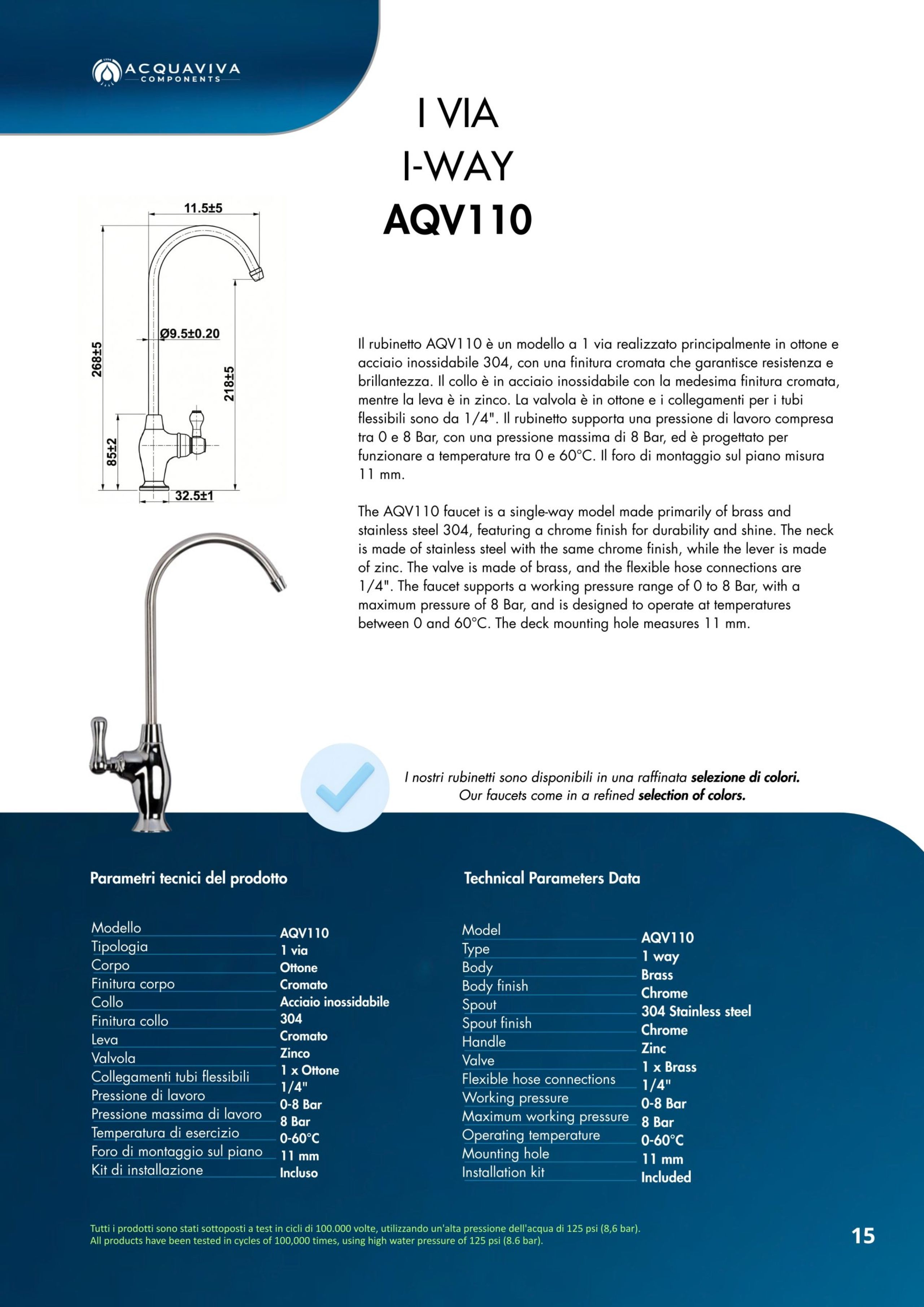 Ogni miscelatore di Acquaviva Components è sottoposto a rigorosi test di qualità che garantiscono l’assenza di rilascio di piombo nell’acqua in uscita e sono privi di nickel; i materiali impiegati sono certificati per un lungo periodo di utilizzo.