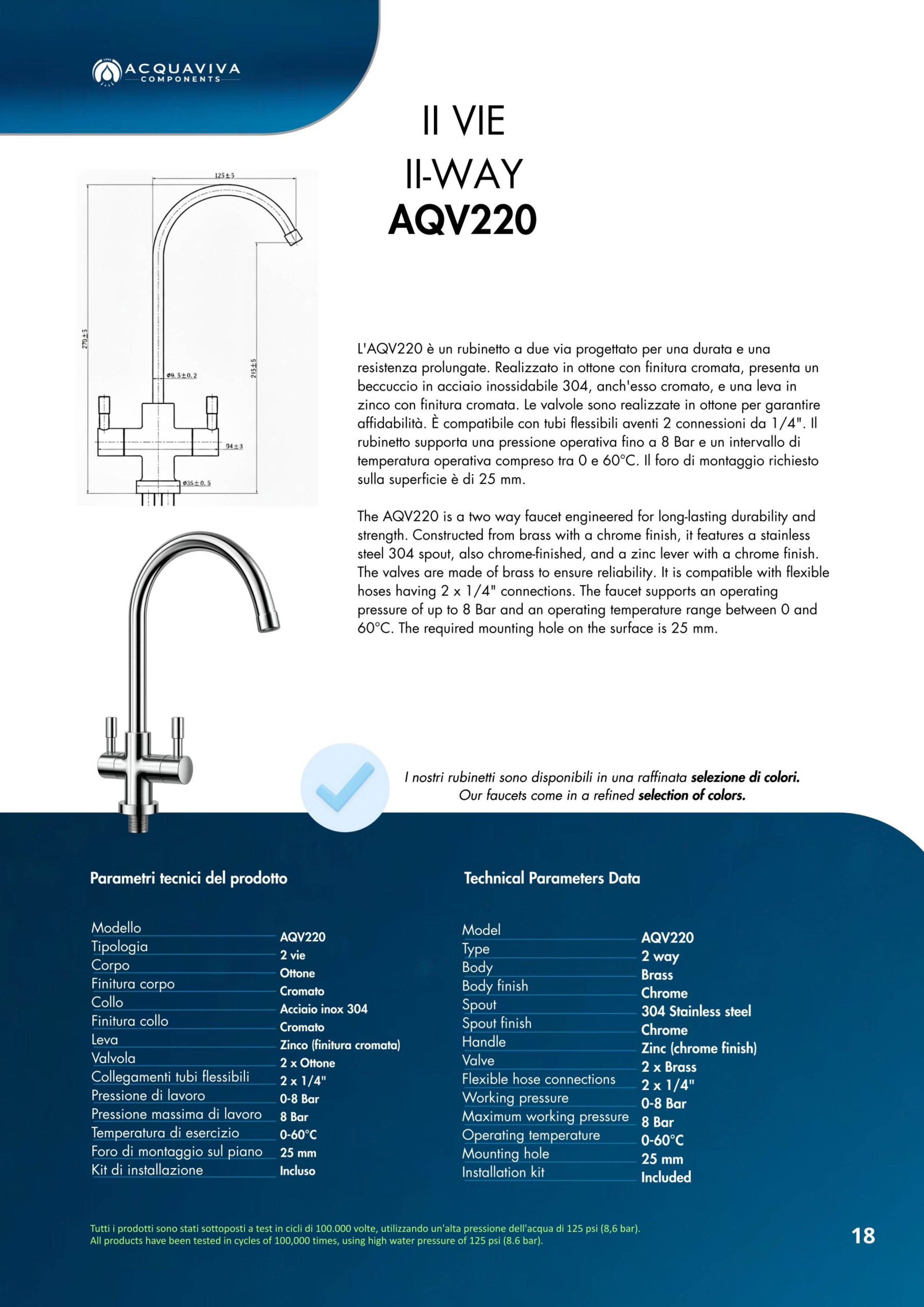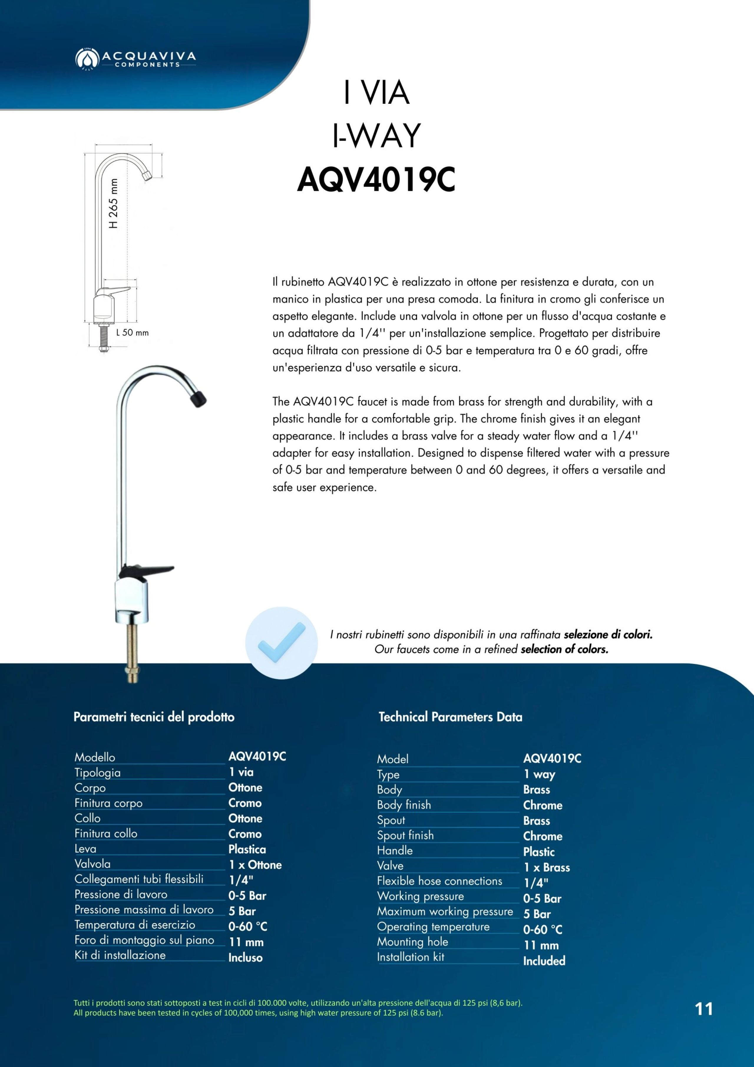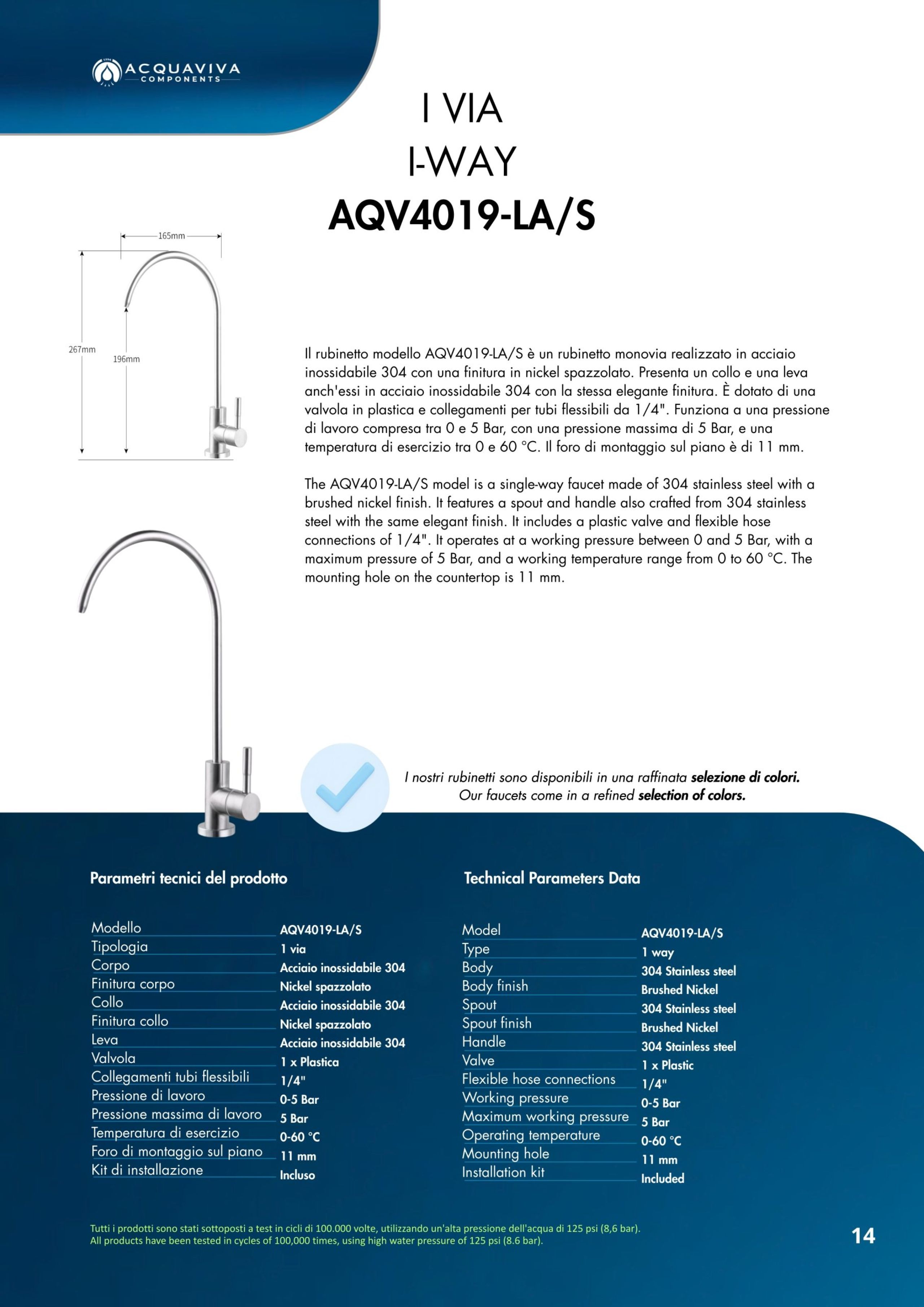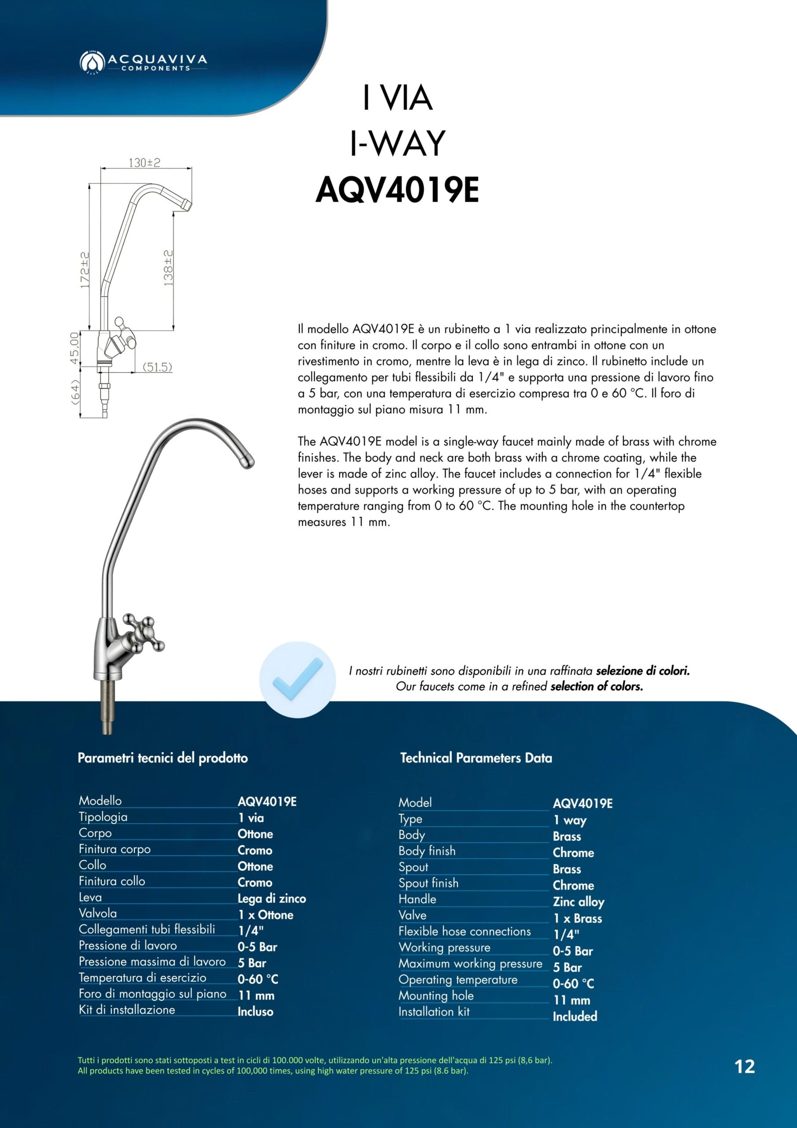 Ogni miscelatore di Acquaviva Components è sottoposto a rigorosi test di qualità che garantiscono l’assenza di rilascio di piombo nell’acqua in uscita e sono privi di nickel; i materiali impiegati sono certificati per un lungo periodo di utilizzo.