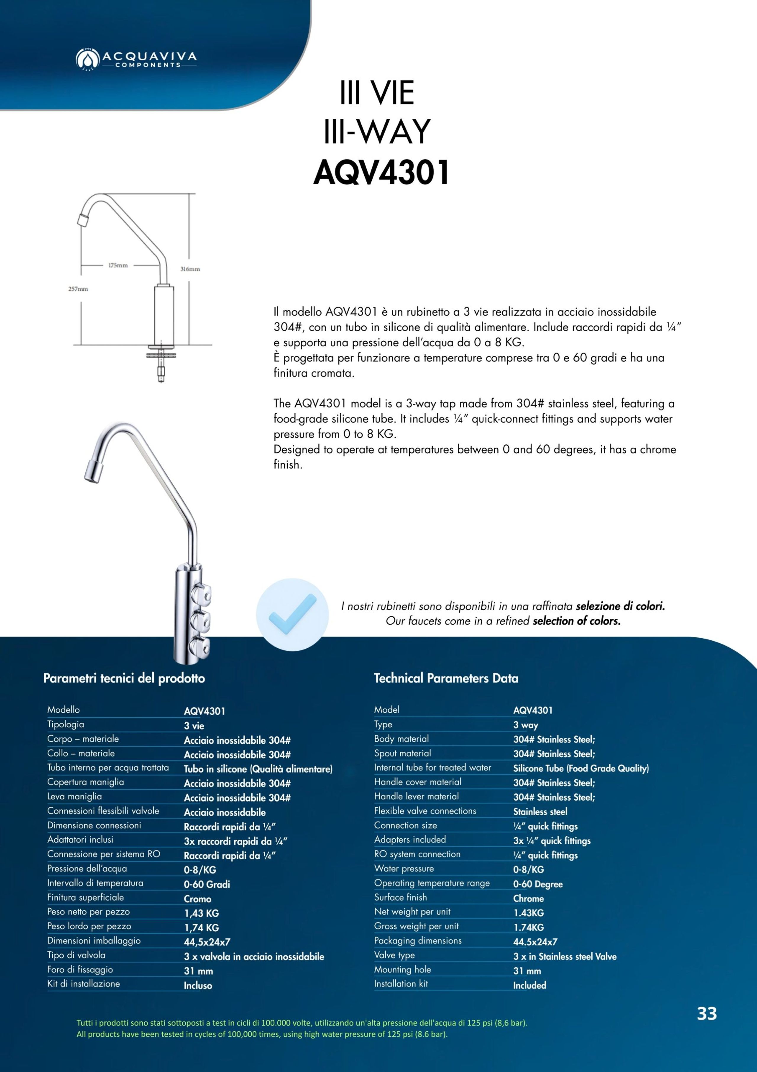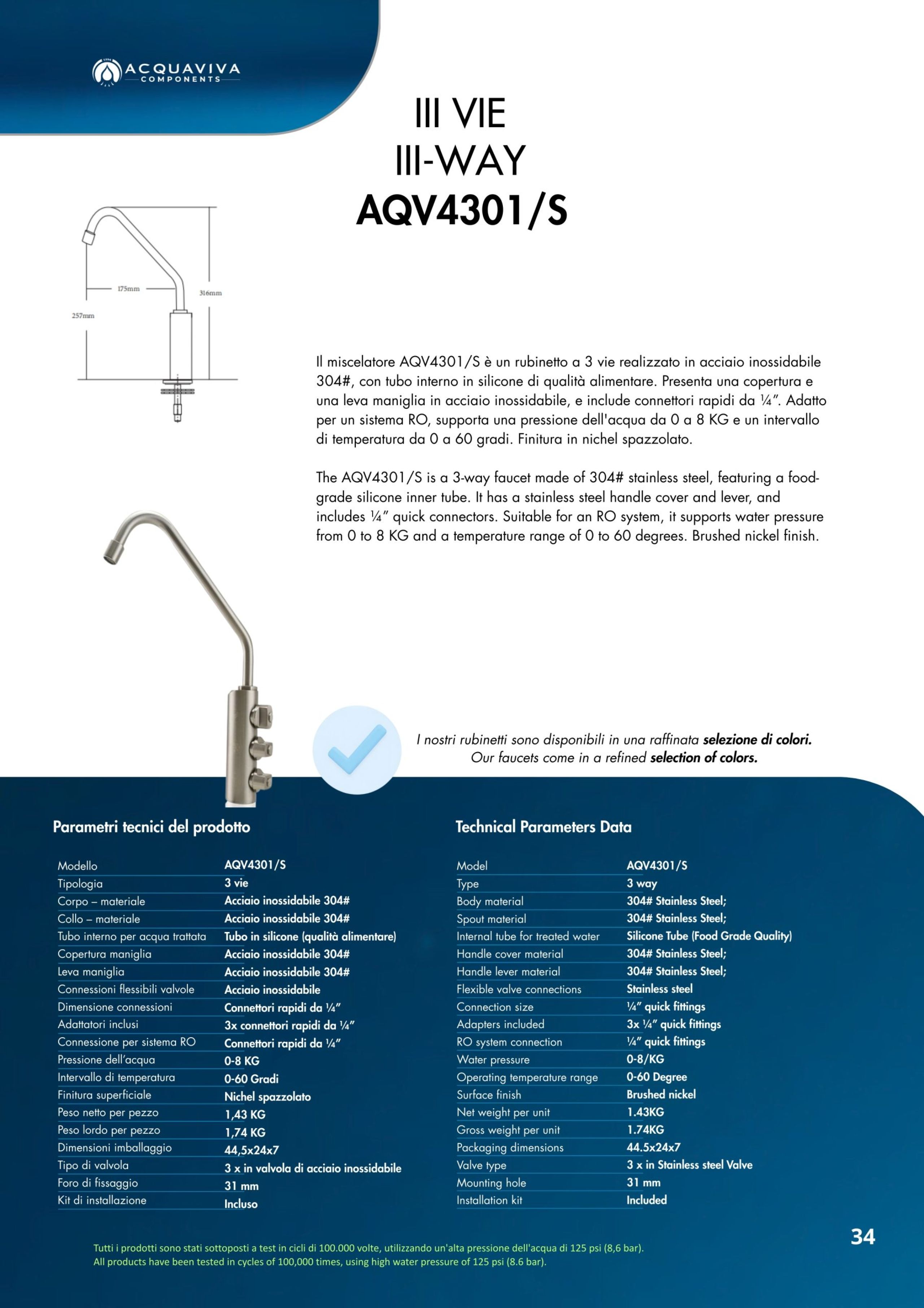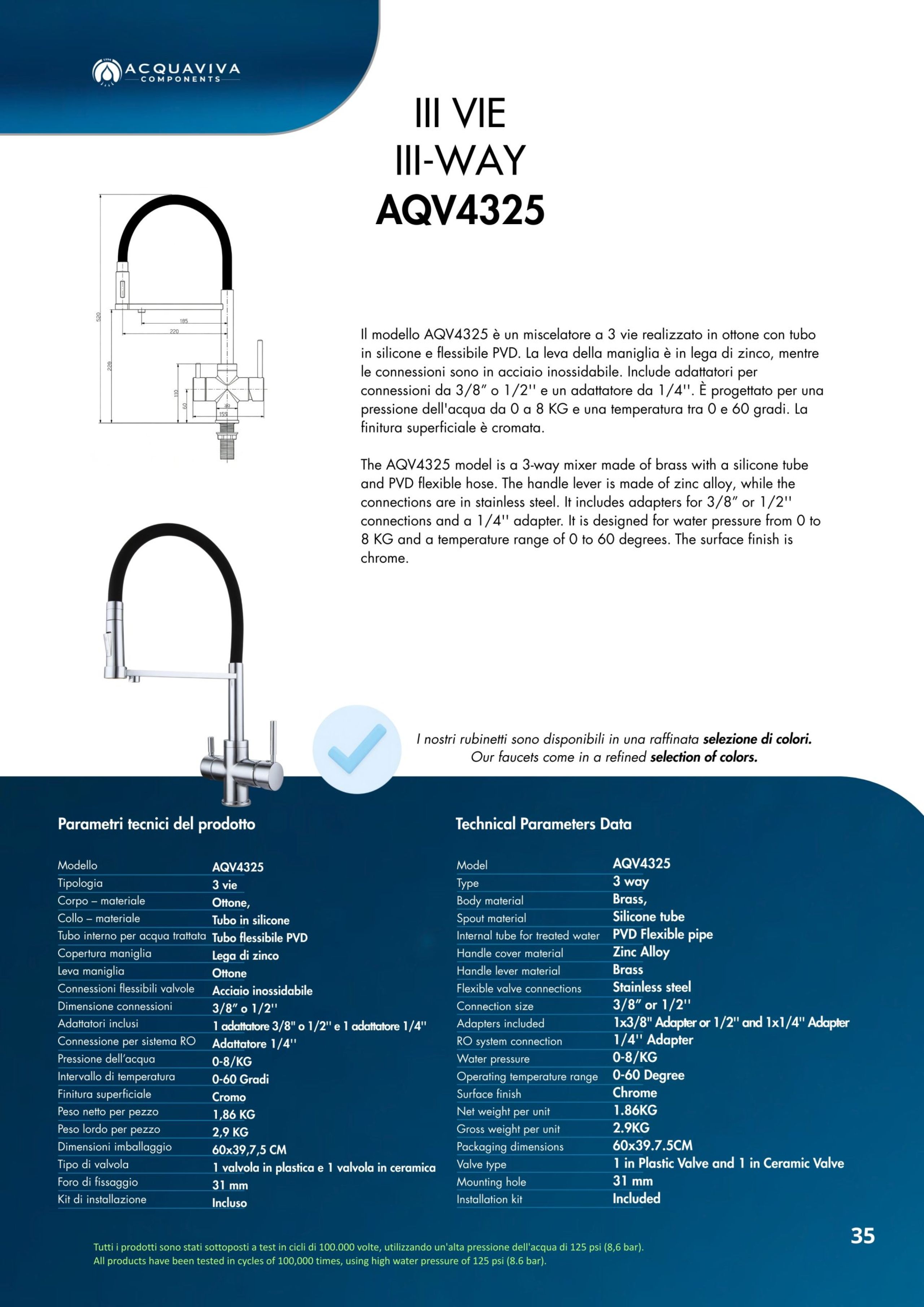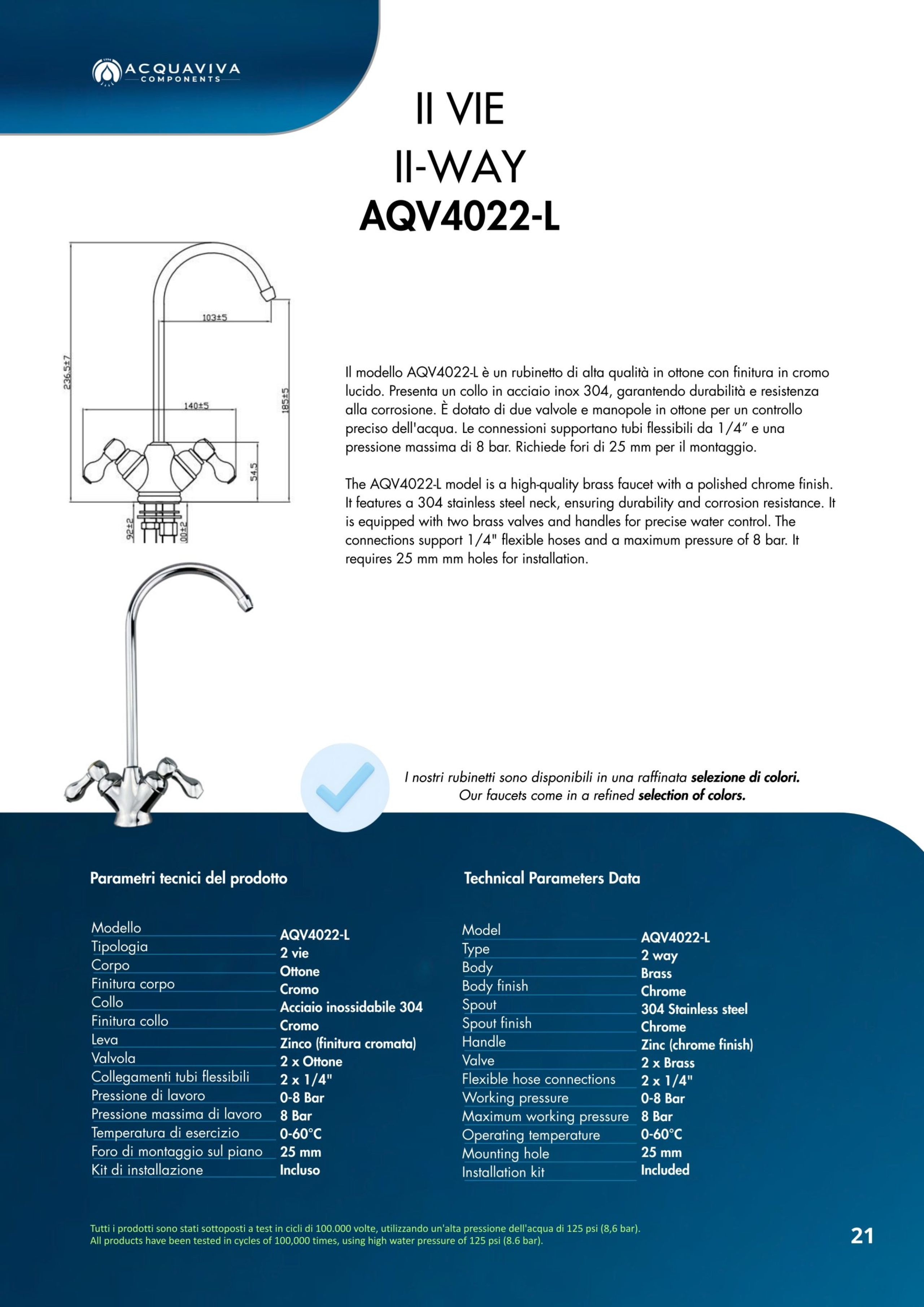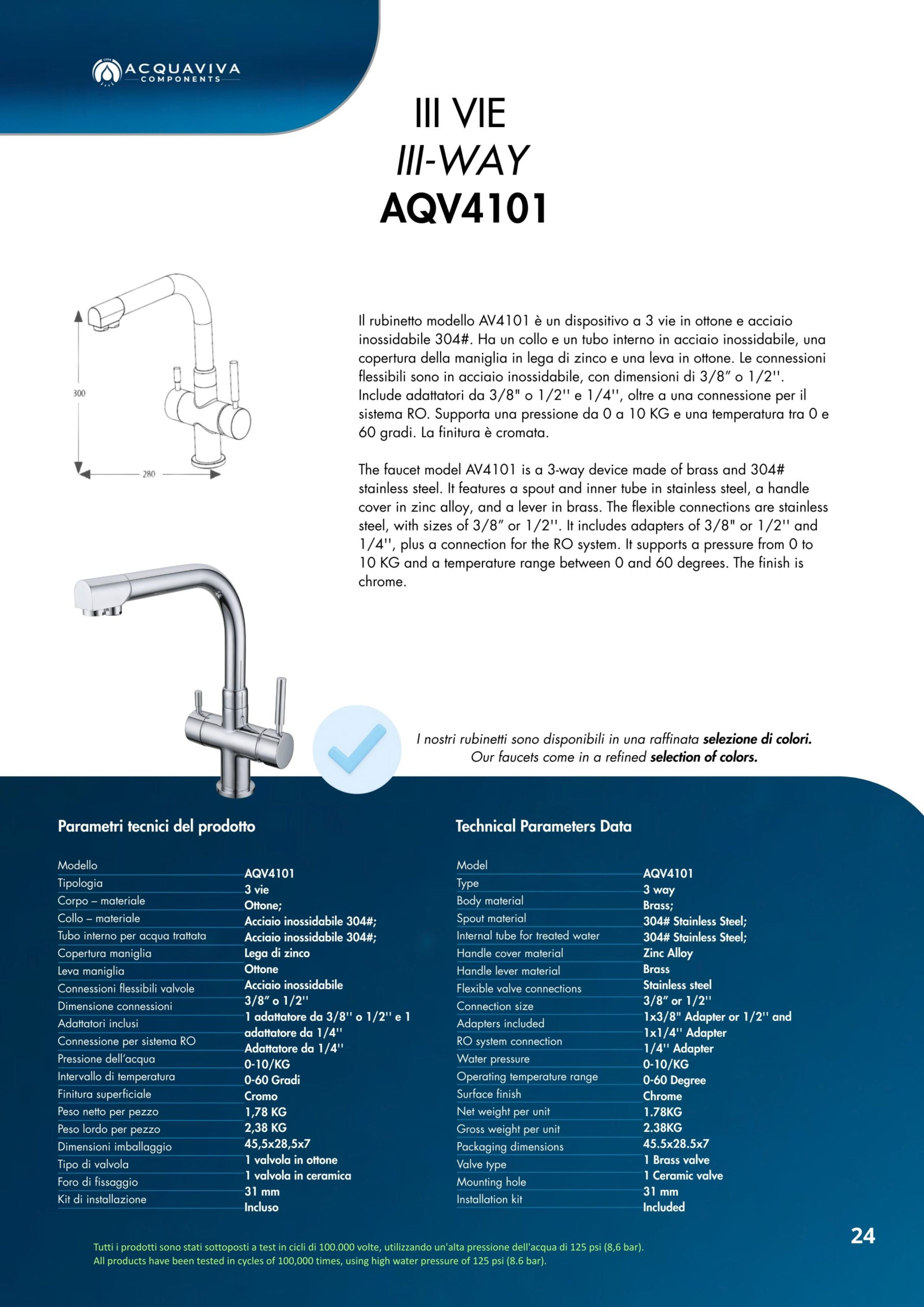 Ogni miscelatore di Acquaviva Components è sottoposto a rigorosi test di qualità che garantiscono l’assenza di rilascio di piombo nell’acqua in uscita e sono privi di nickel; i materiali impiegati sono certificati per un lungo periodo di utilizzo.