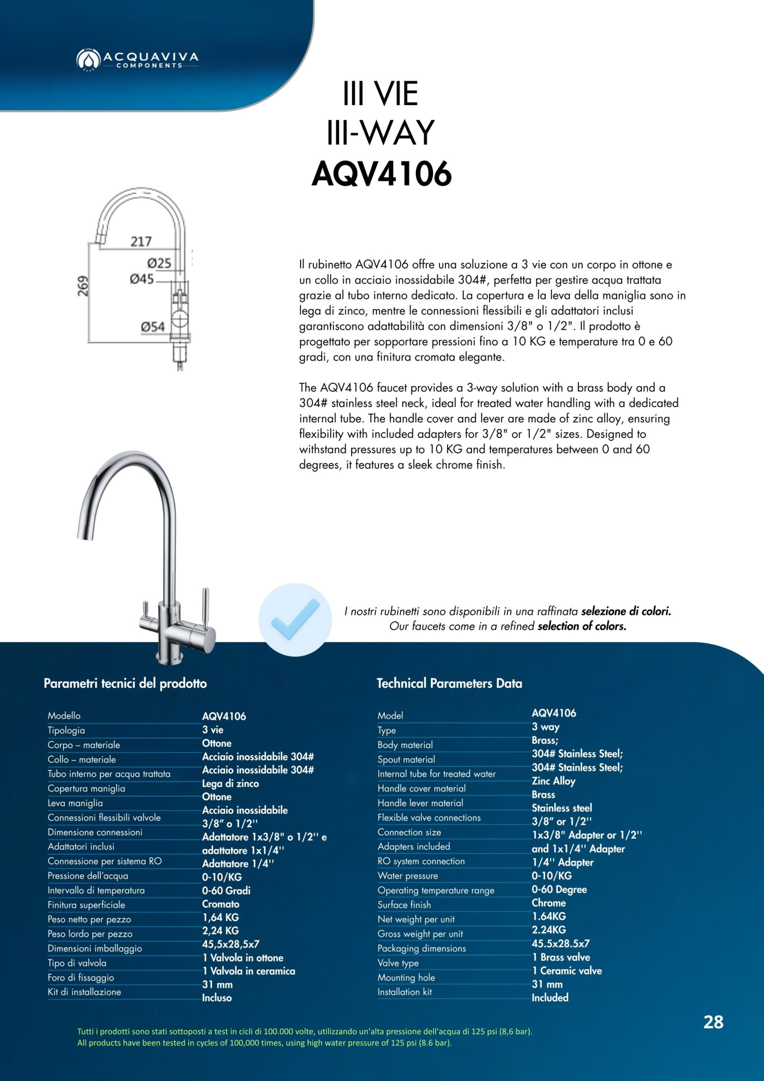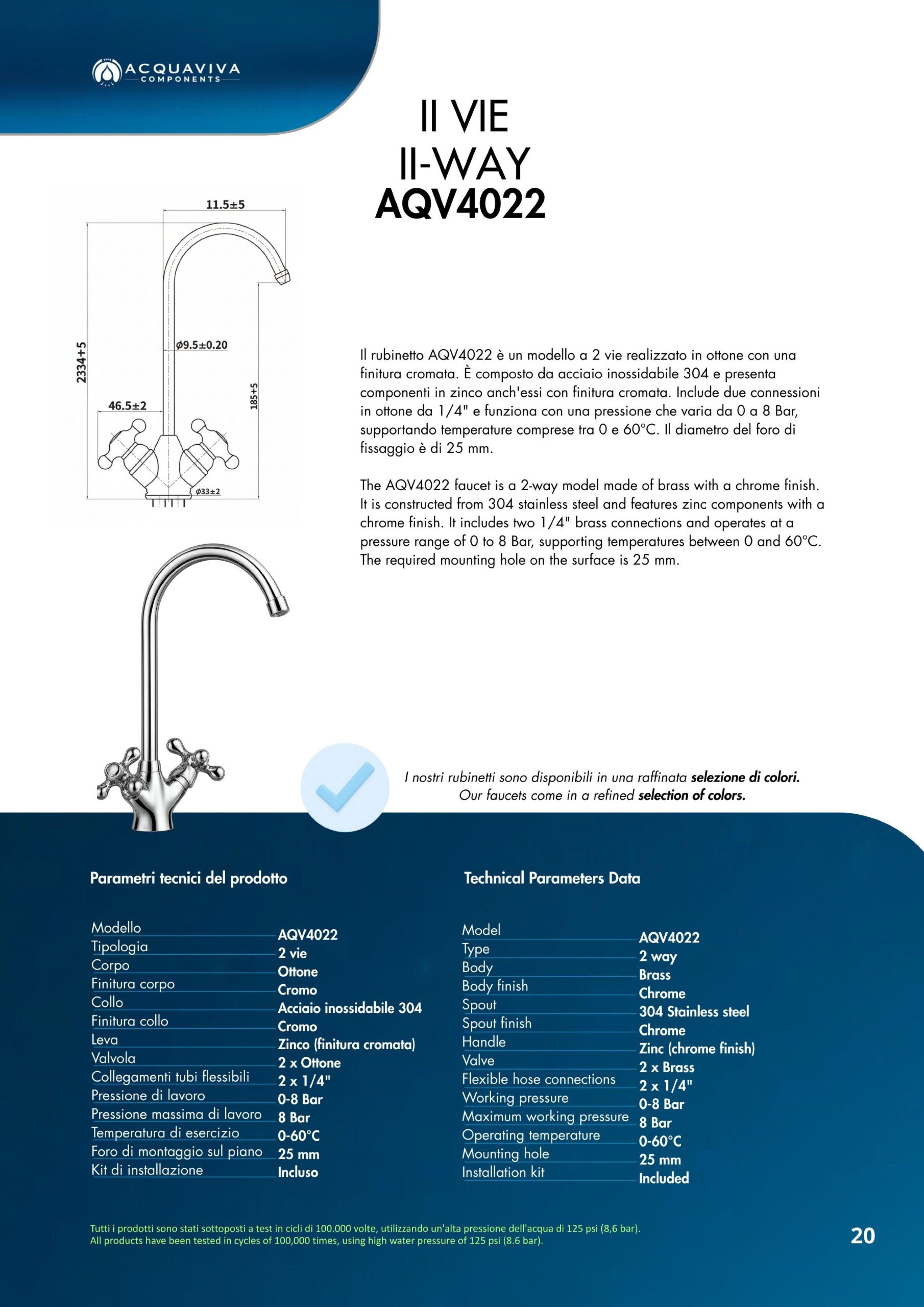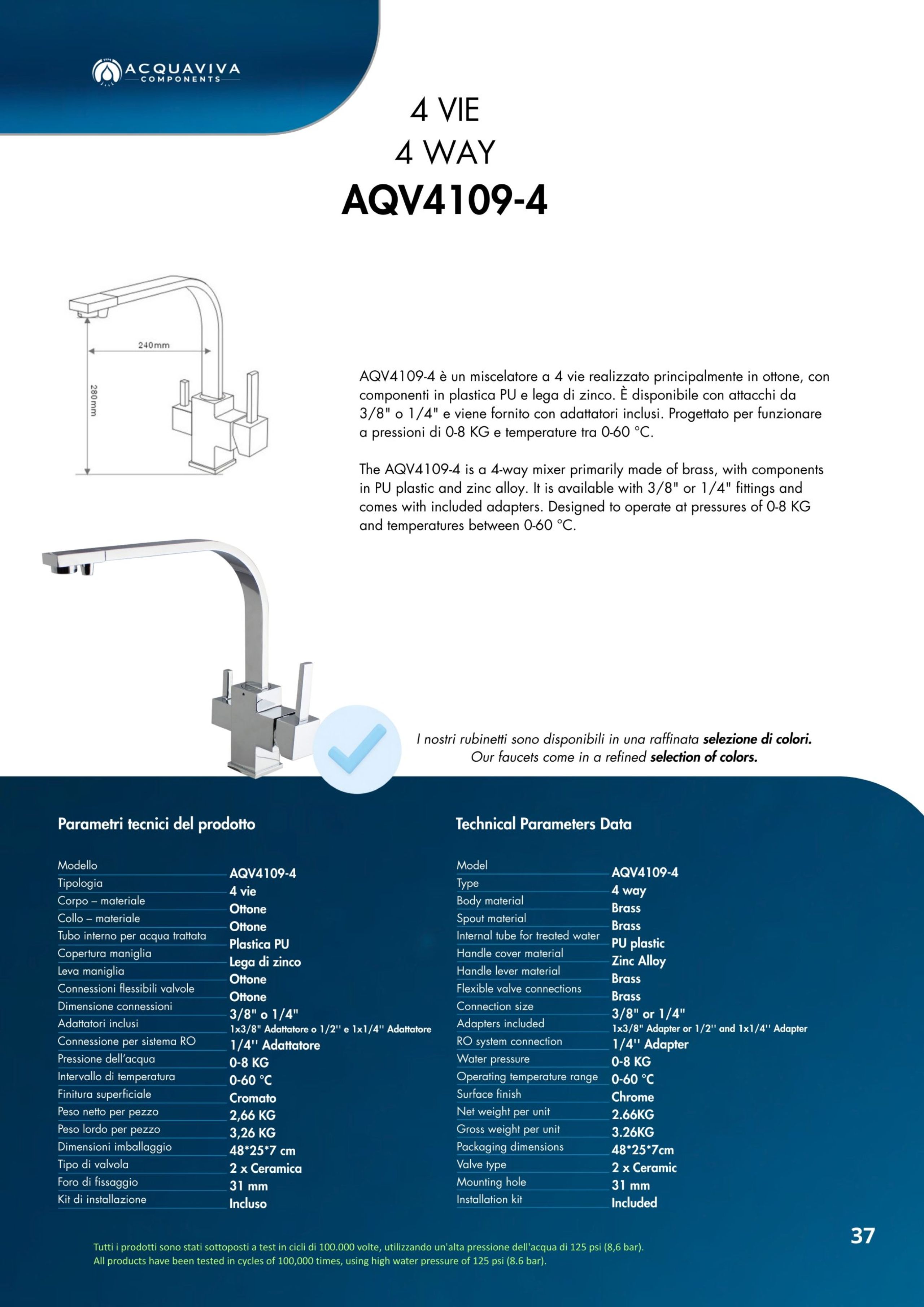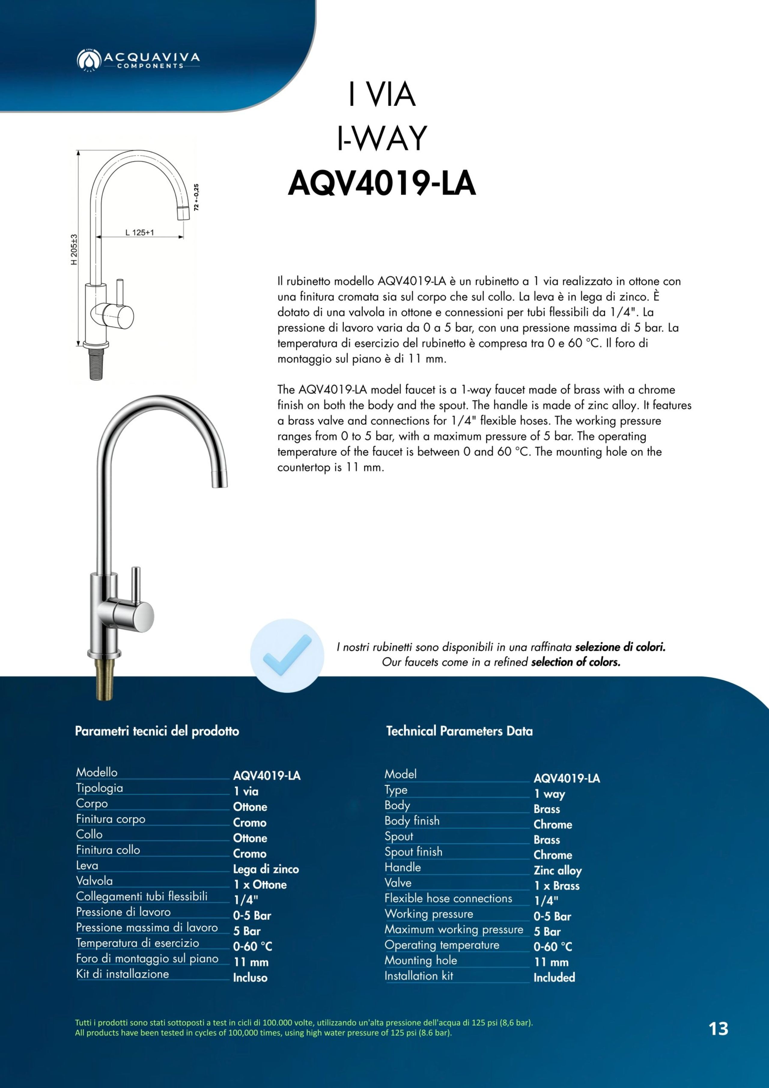 Ogni miscelatore di Acquaviva Components è sottoposto a rigorosi test di qualità che garantiscono l’assenza di rilascio di piombo nell’acqua in uscita e sono privi di nickel; i materiali impiegati sono certificati per un lungo periodo di utilizzo.