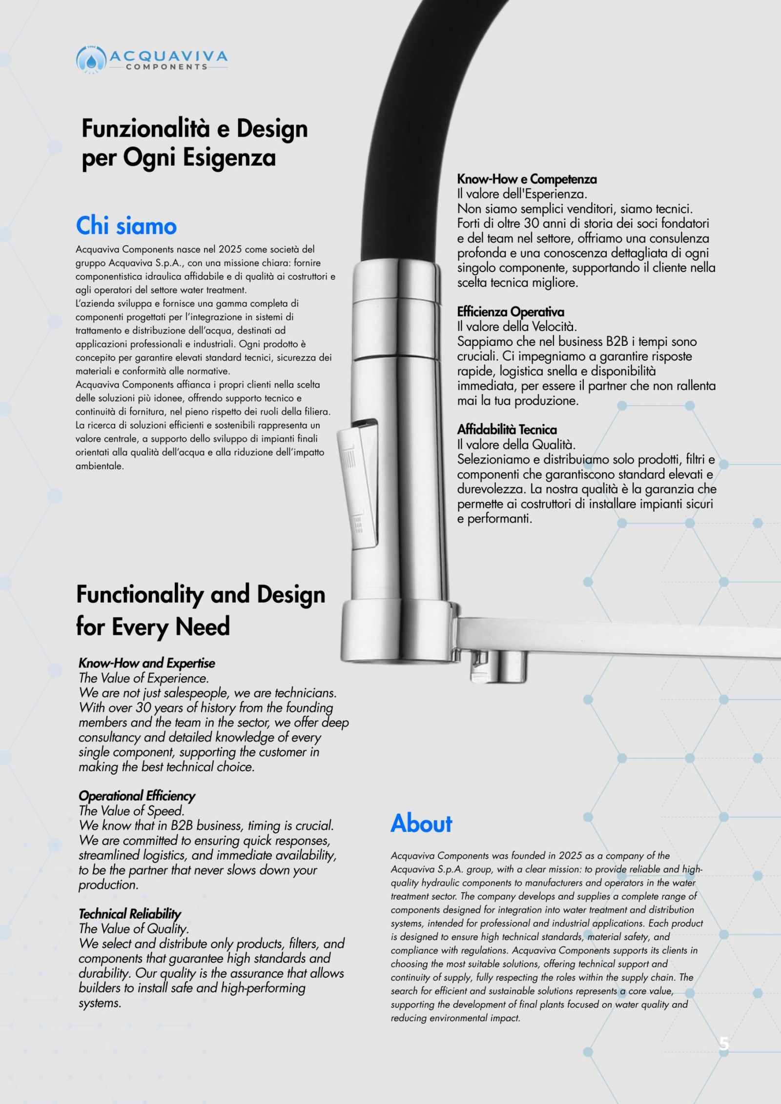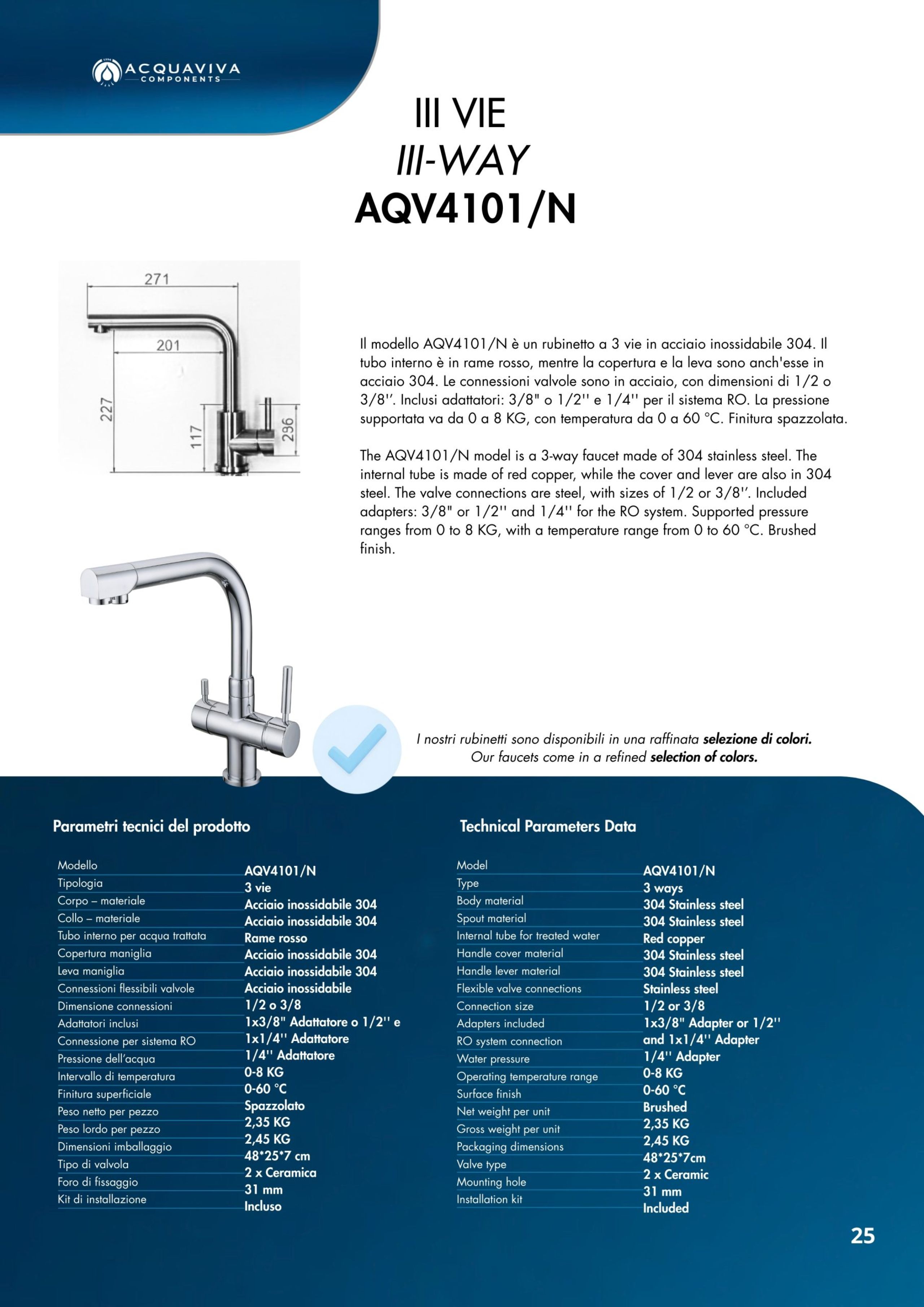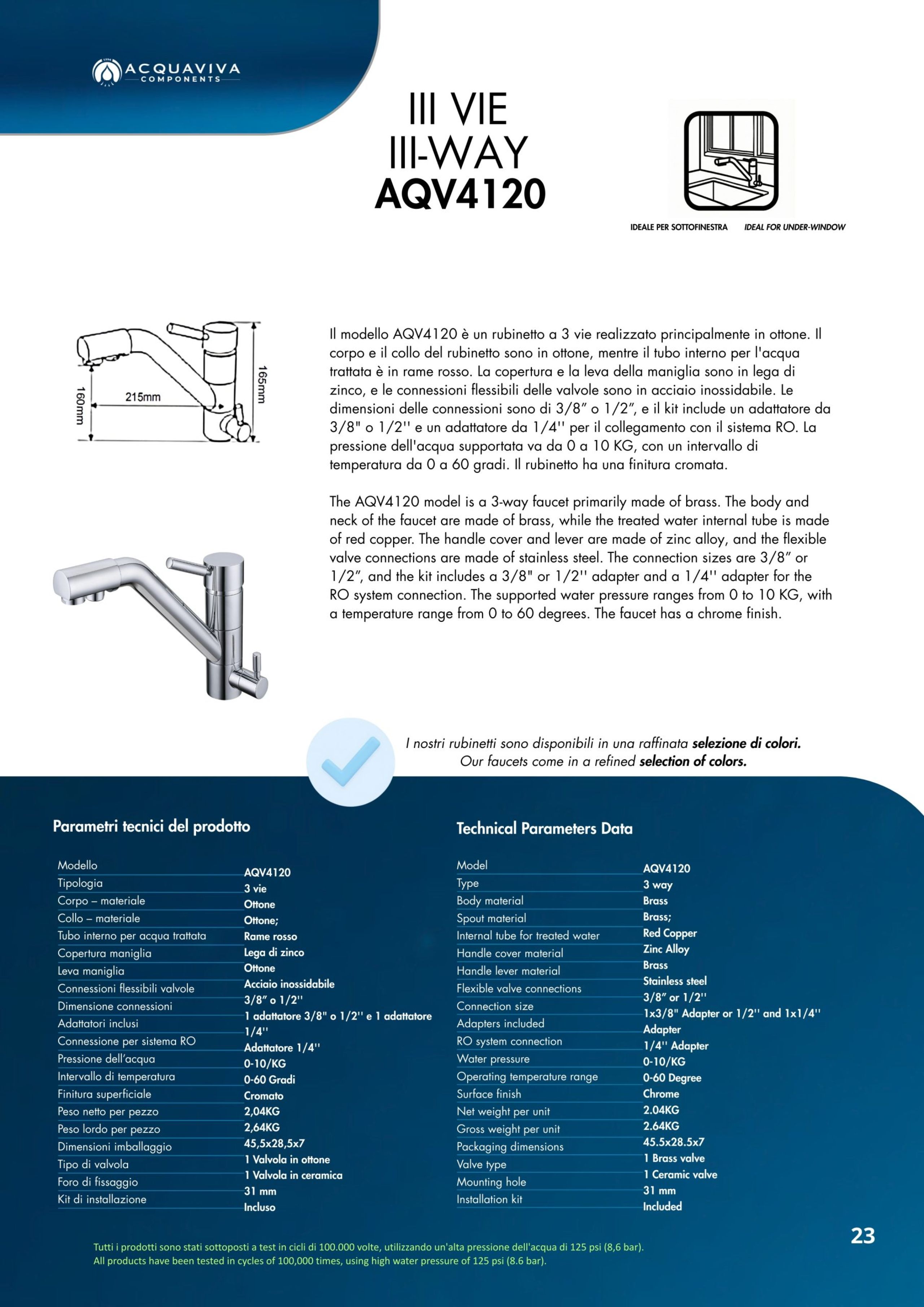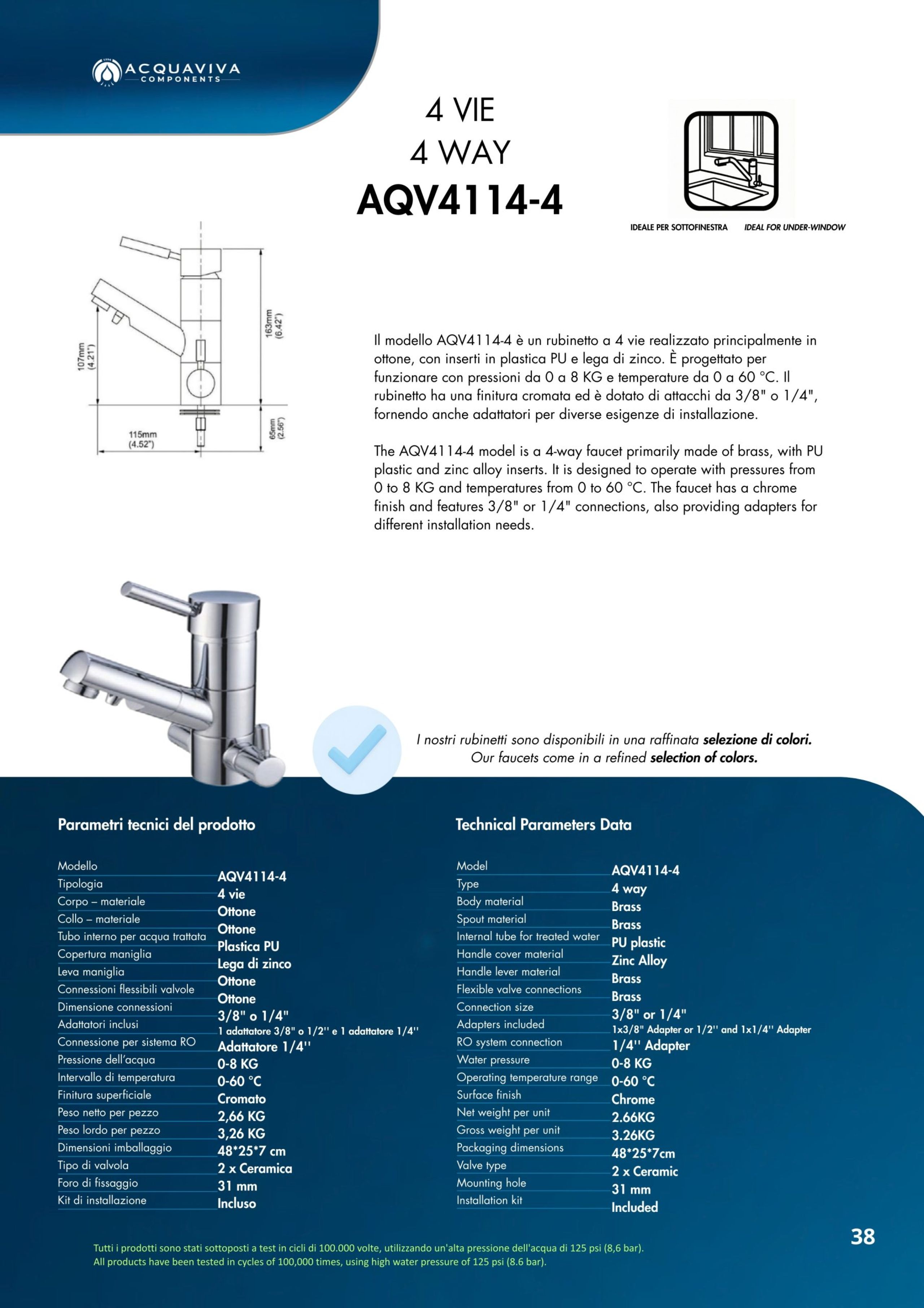 Ogni miscelatore di Acquaviva Components è sottoposto a rigorosi test di qualità che garantiscono l’assenza di rilascio di piombo nell’acqua in uscita e sono privi di nickel; i materiali impiegati sono certificati per un lungo periodo di utilizzo.